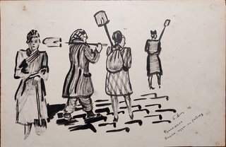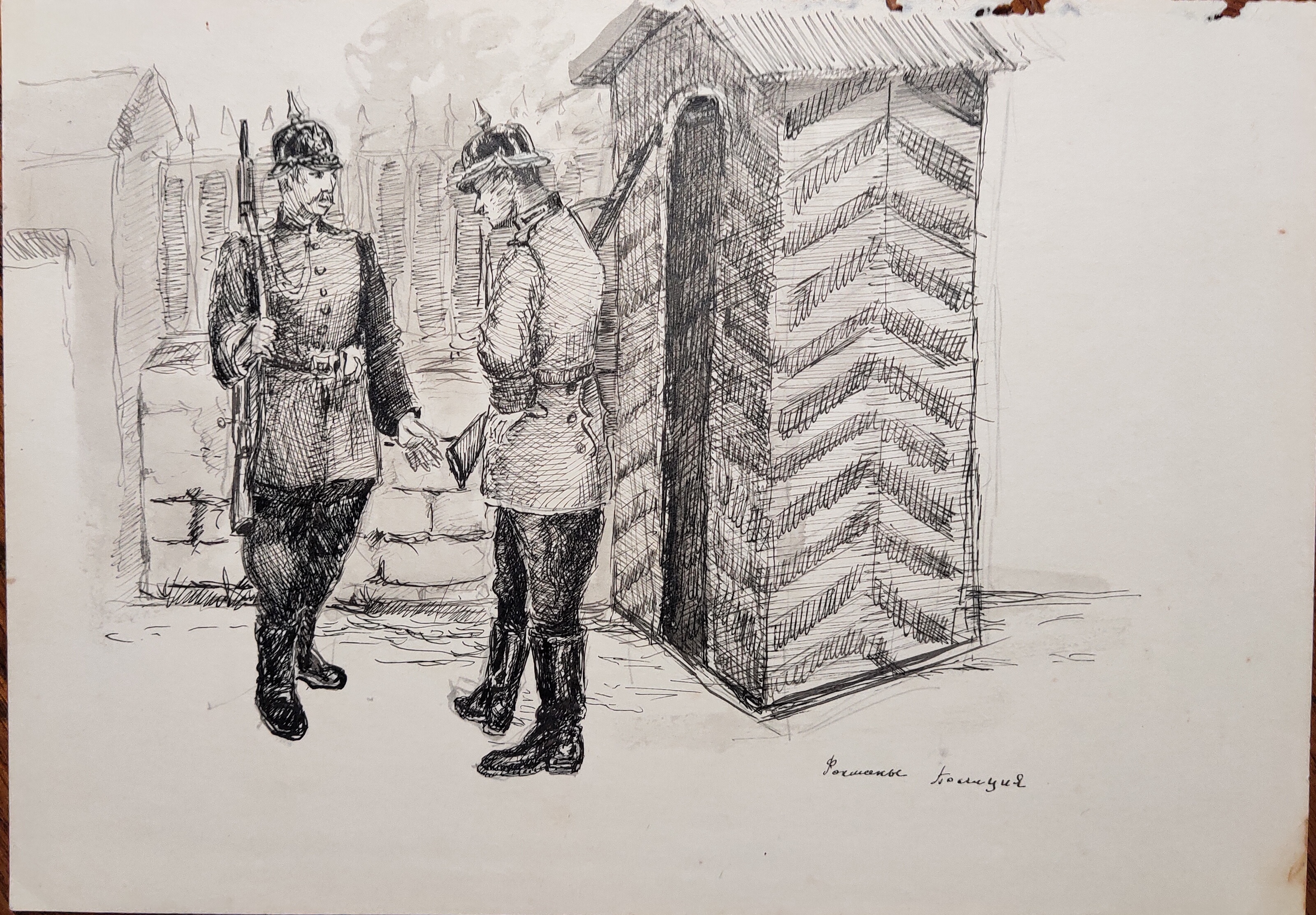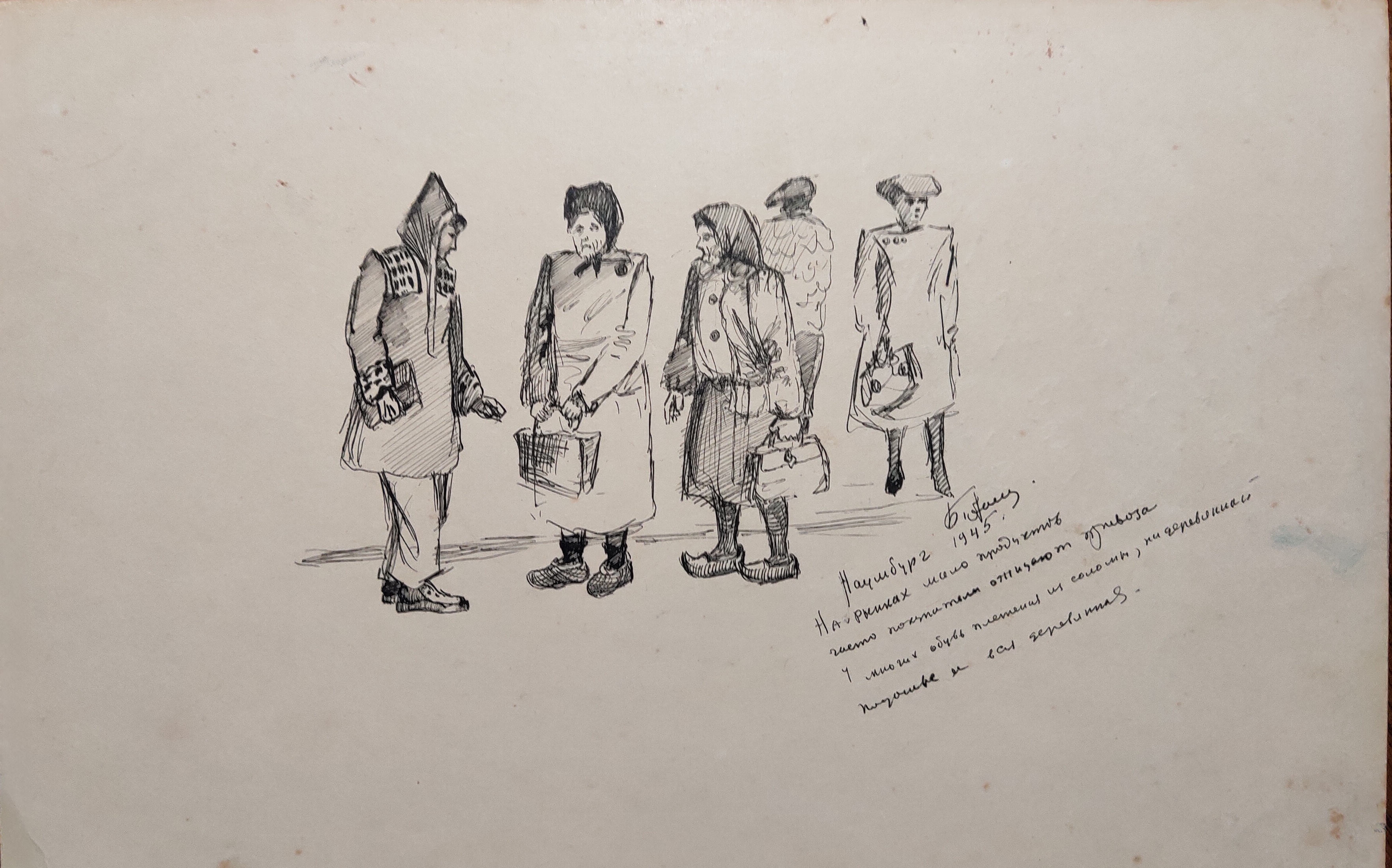 Рисунок "Наумбург 1945г." "На рынках мало продуктов, часто похитители ожидают привода. У многих обувь плетённая из соломы, на деревянной подошве и вся деревянная "