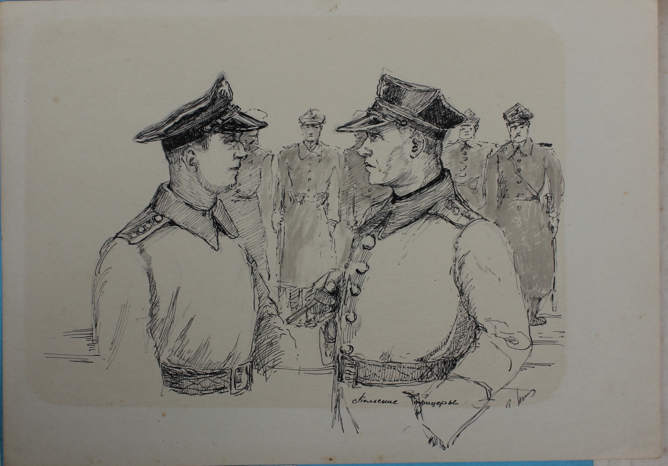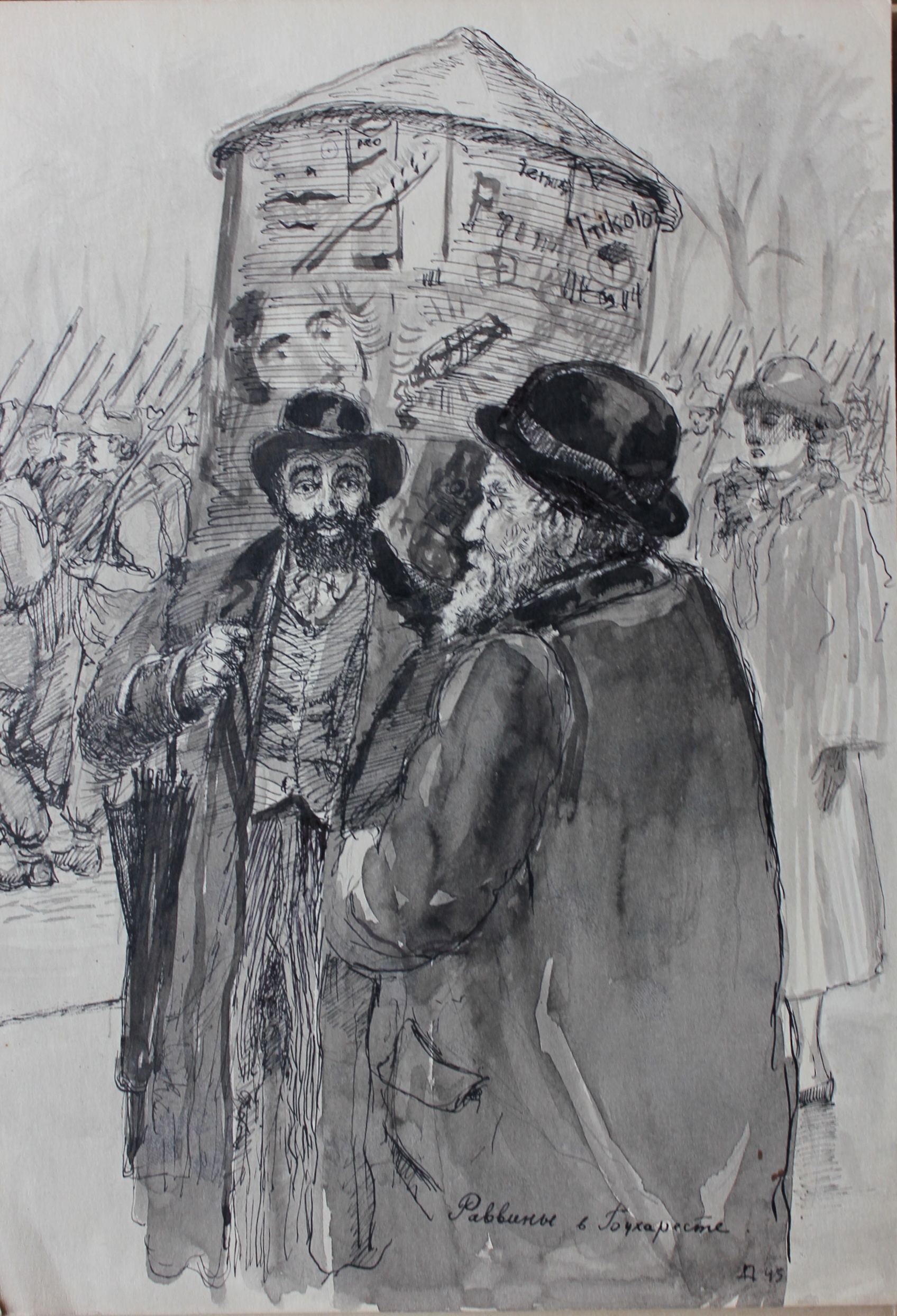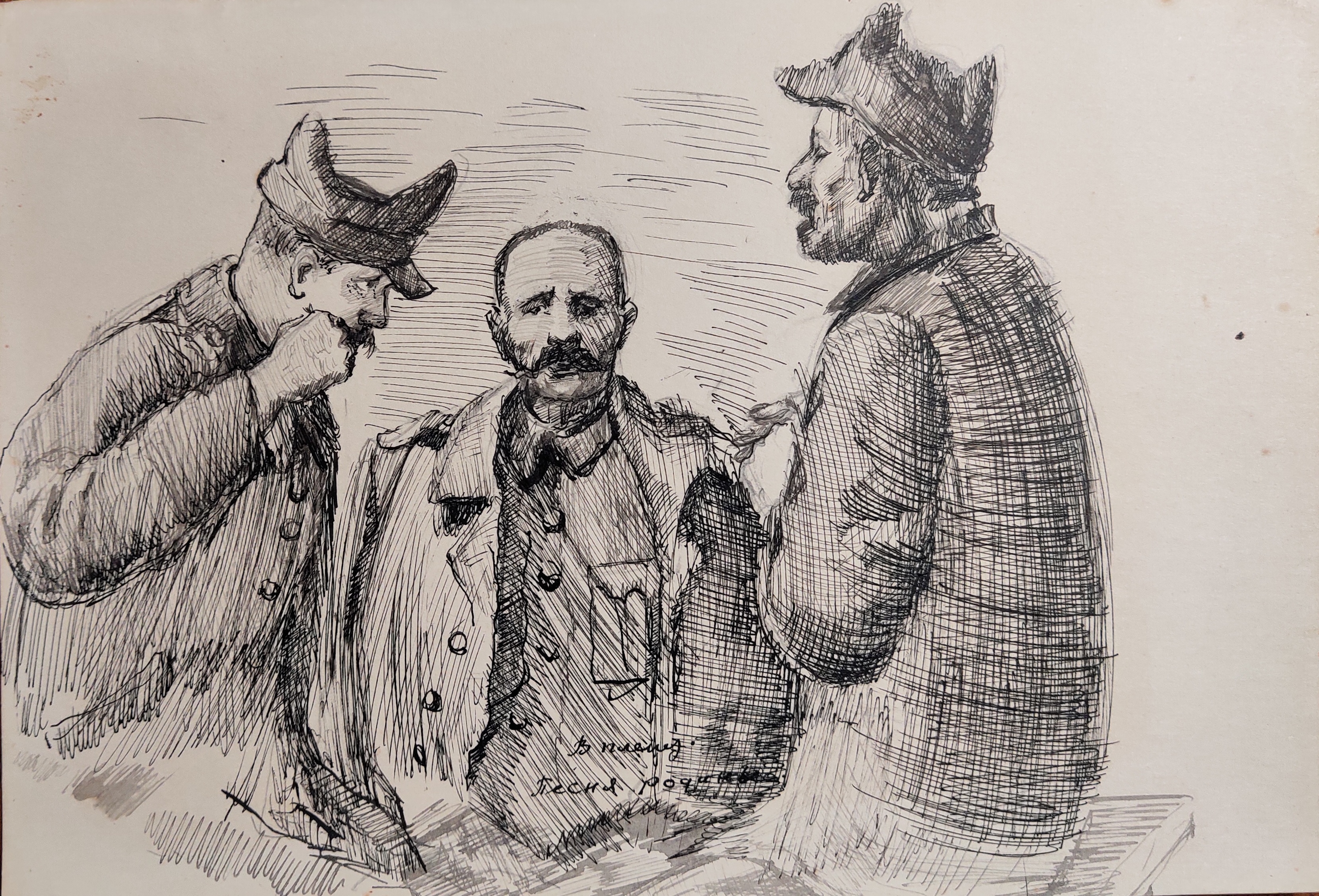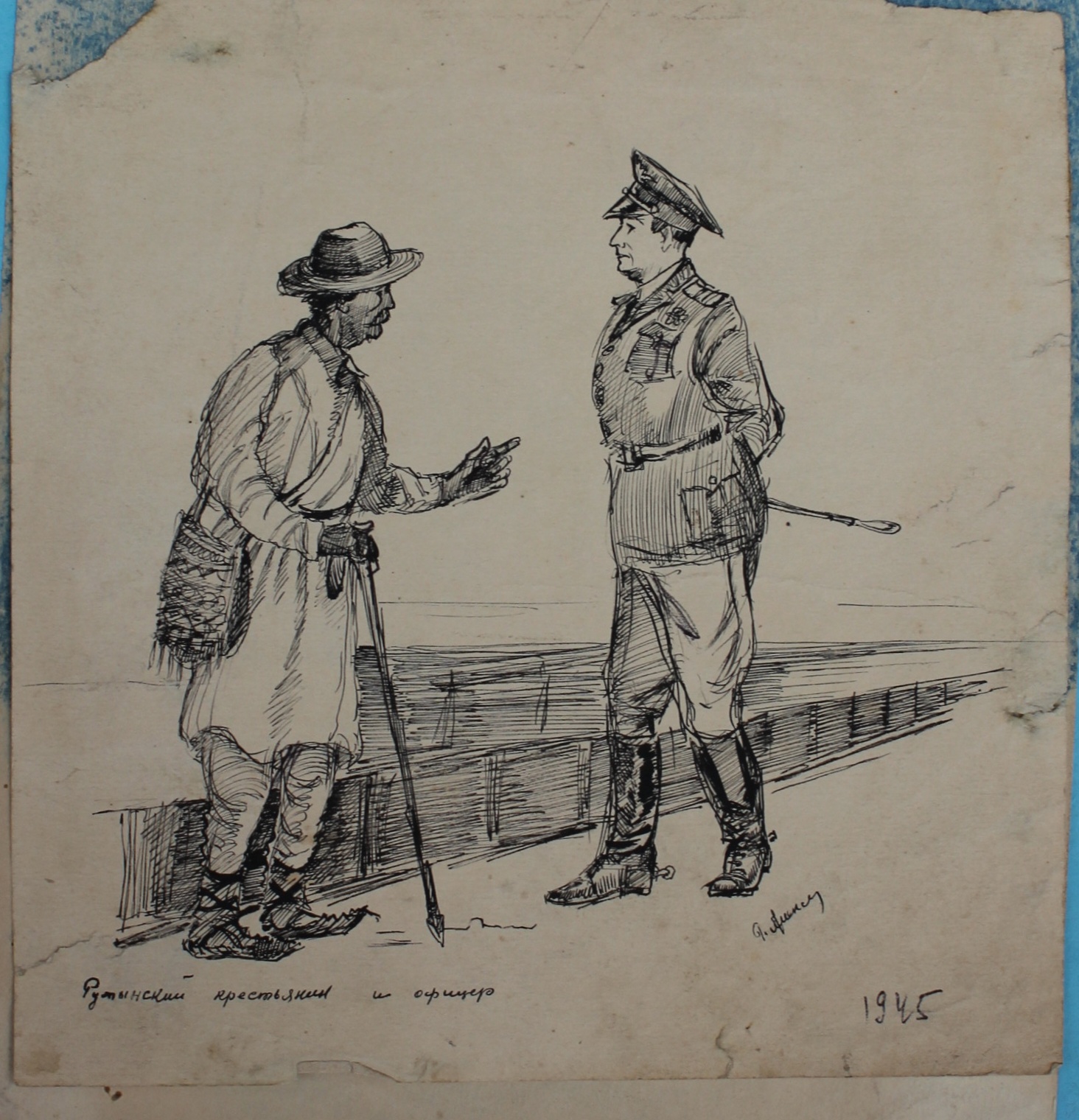Рисунок тушью и пером "Румынский крестьянин и офицер"1945г.,,16