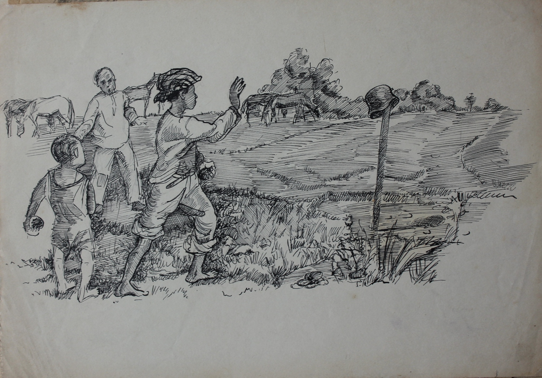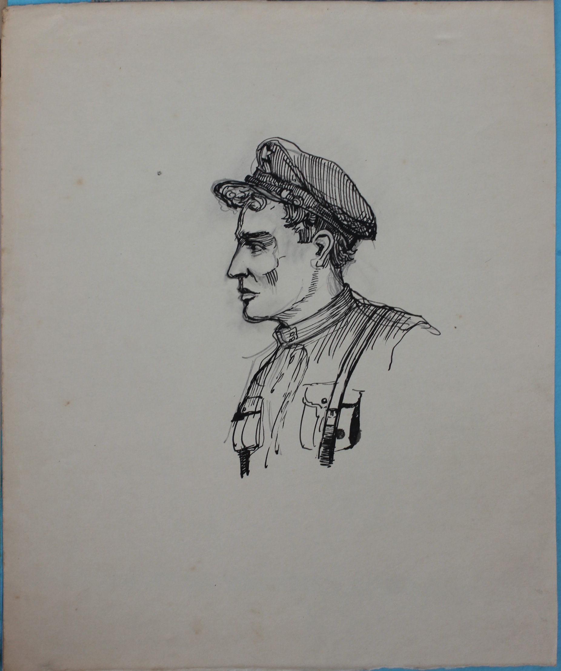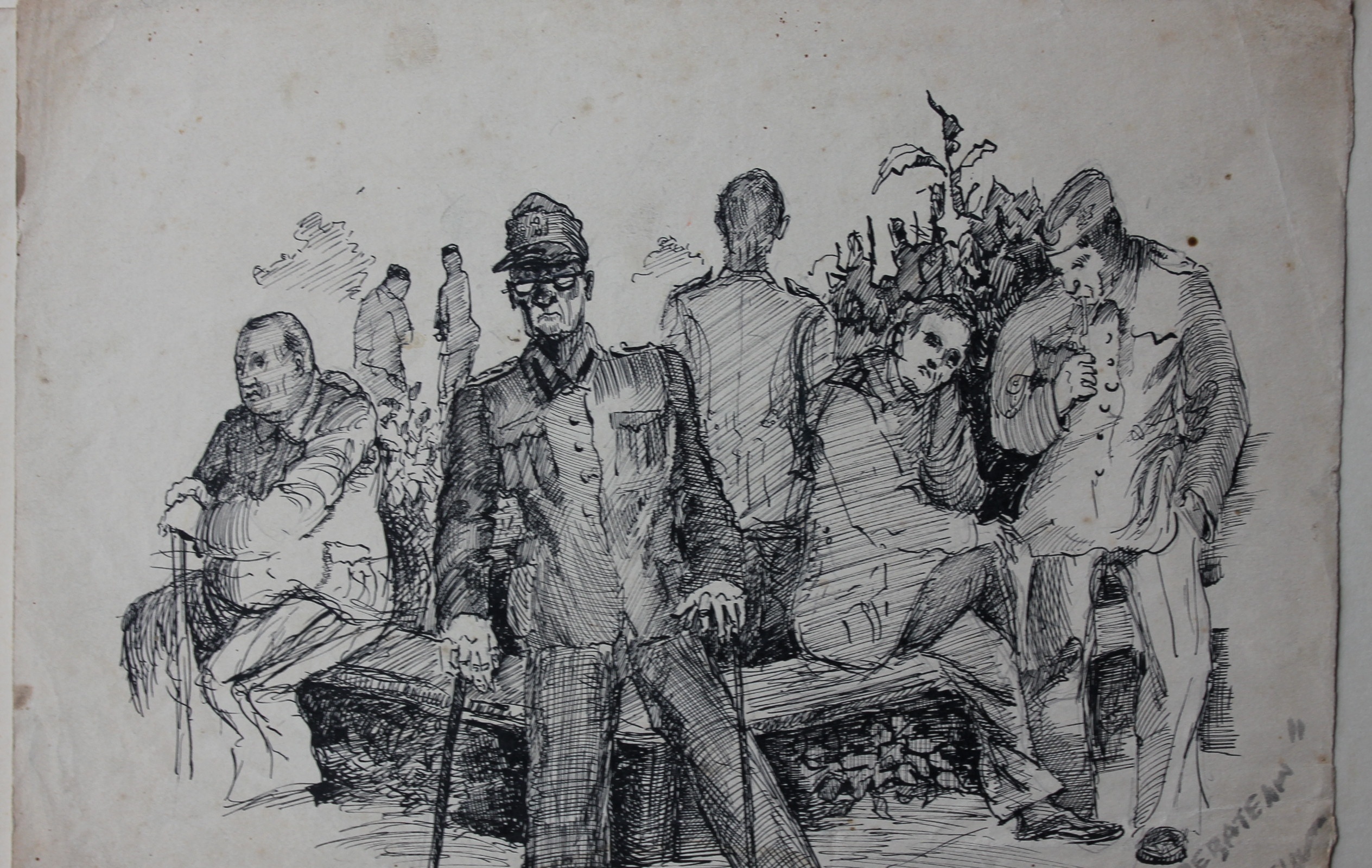 Рисунок тушью и пером "Румынский крестьянин и офицер"1945г.,,16