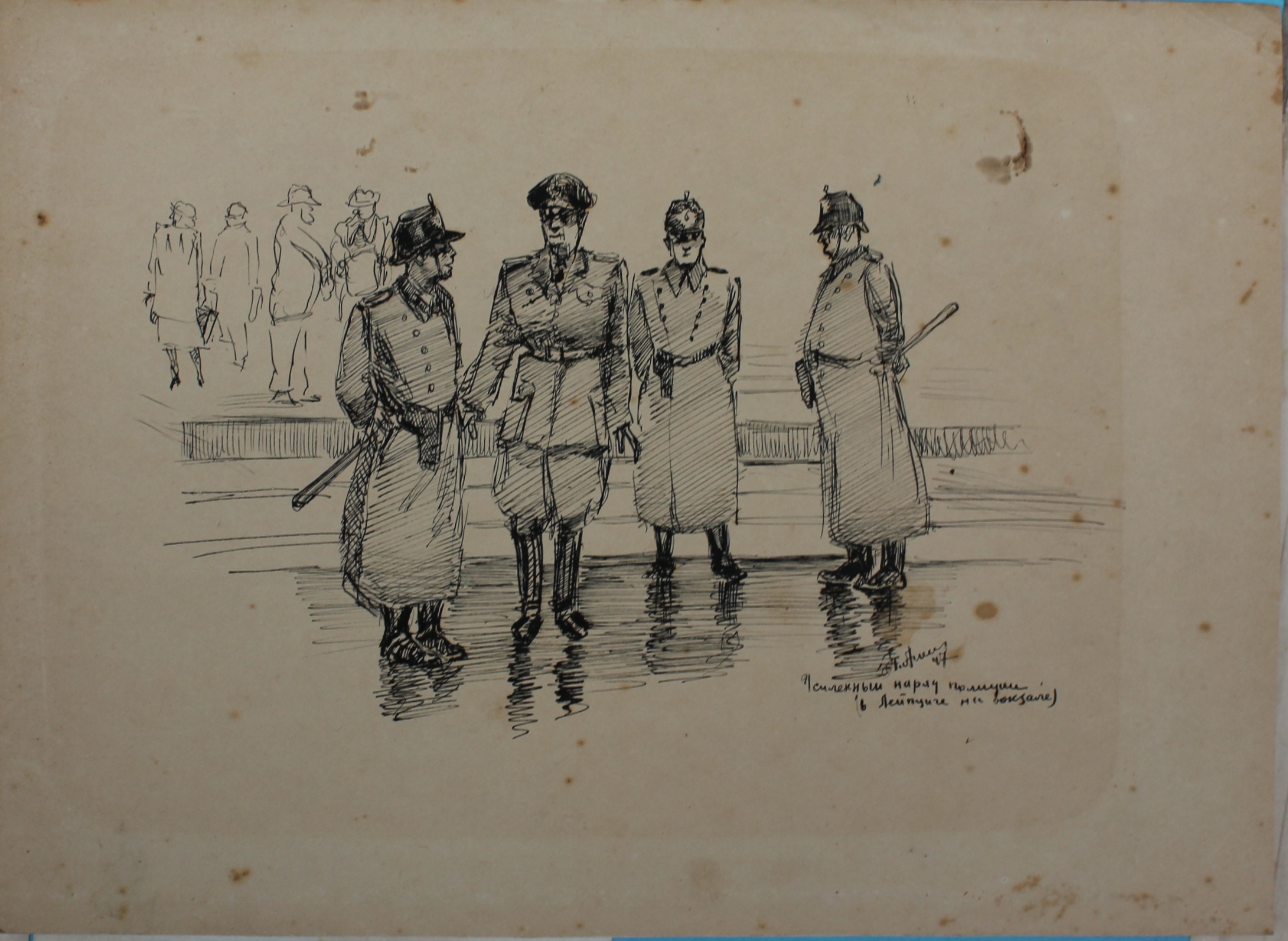 Рисунок тушью и пером "Усиленный наряд полиции (в Лейпциге на вокзале) "33