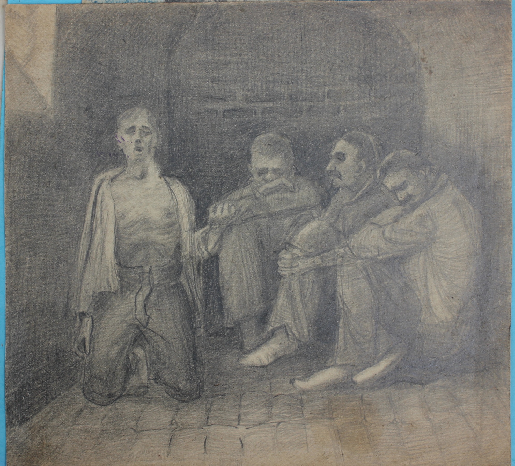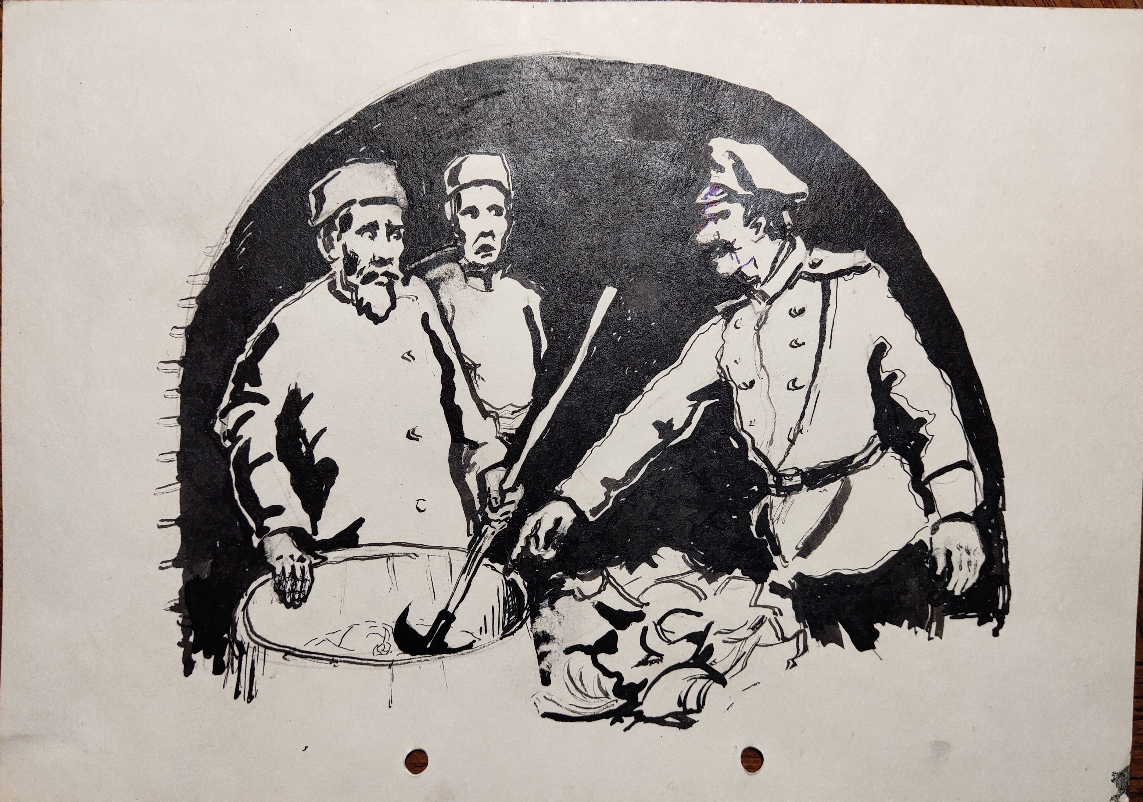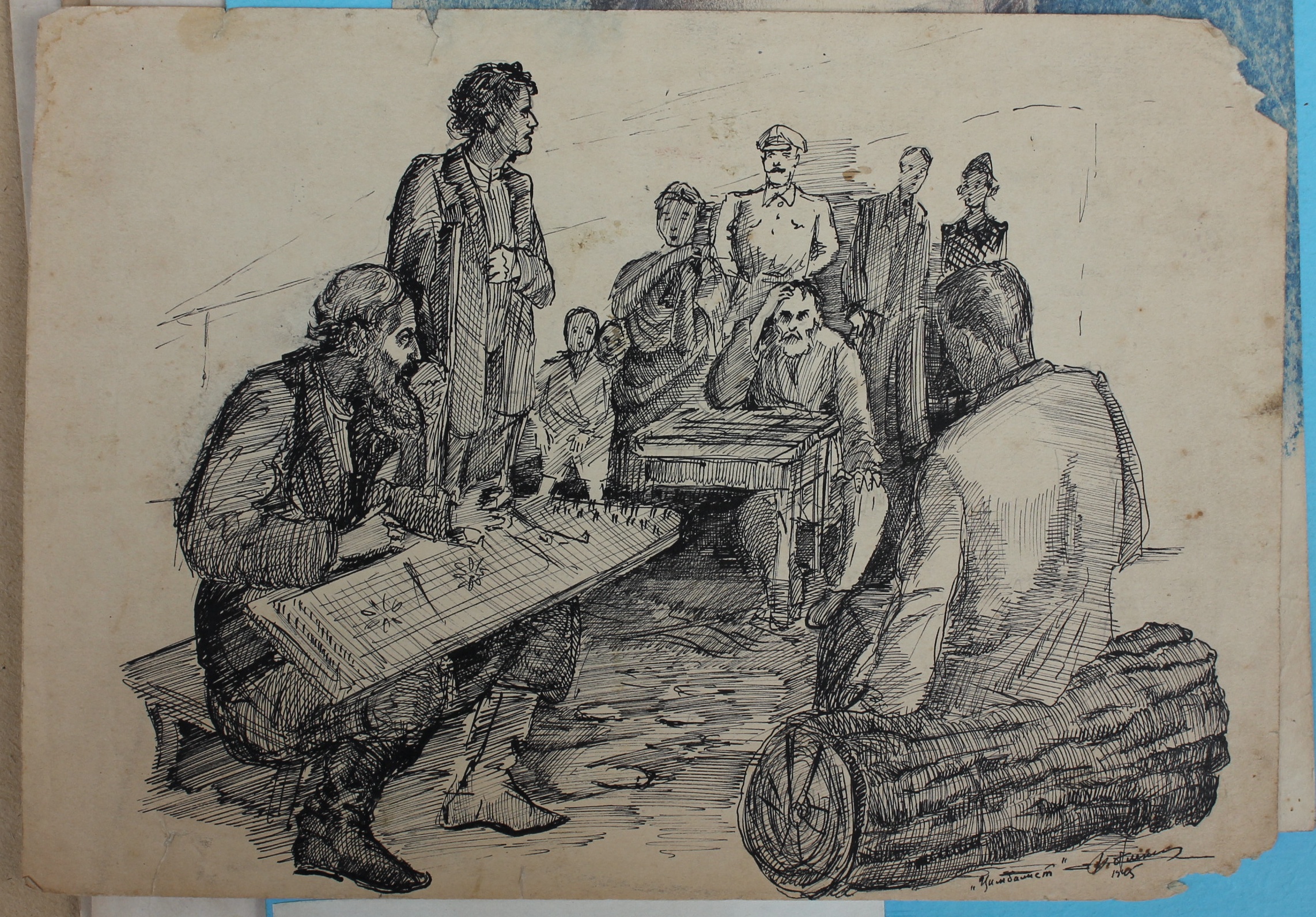 Рисунок тушью и пером "Военнопленные поют песню о родине"