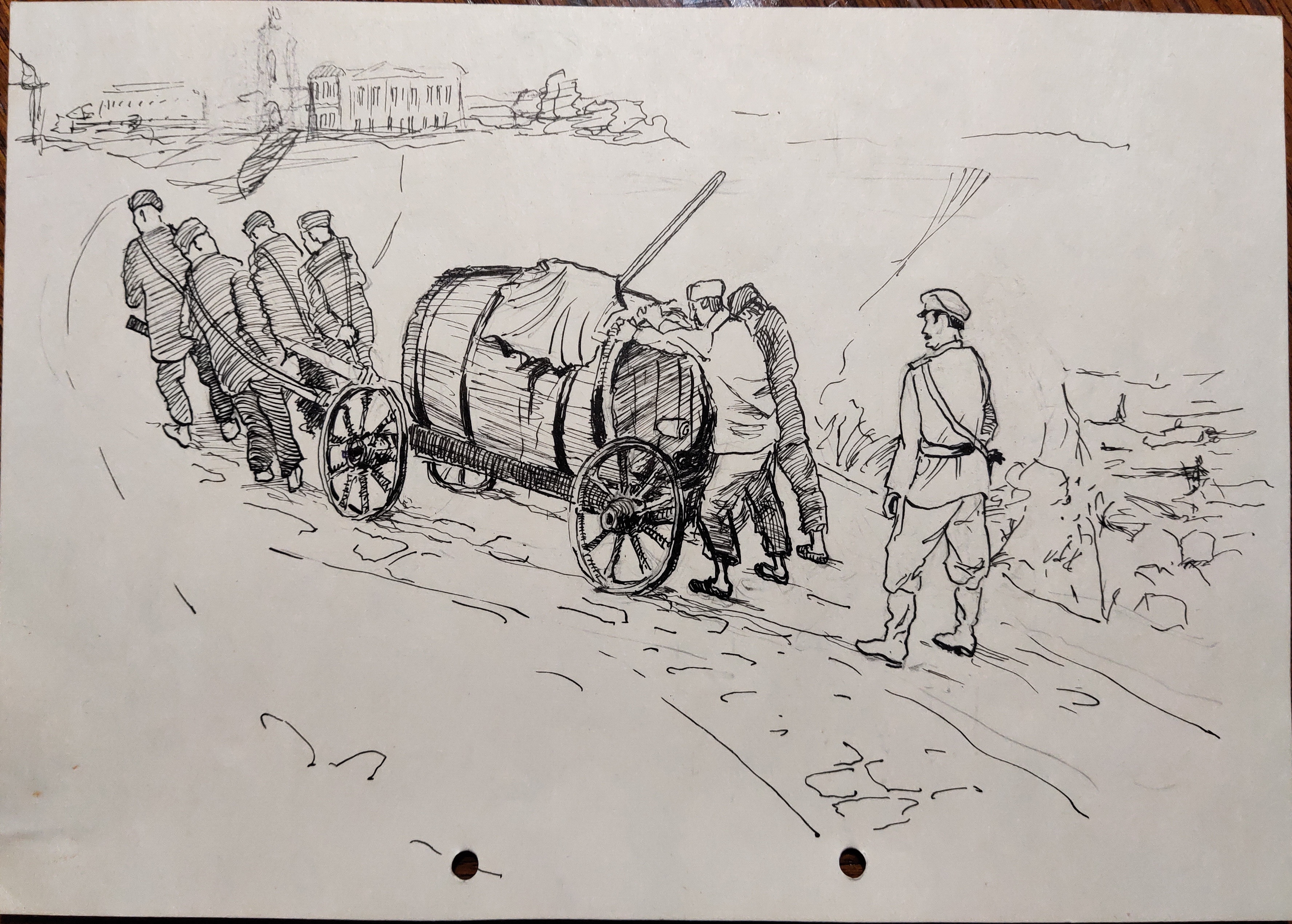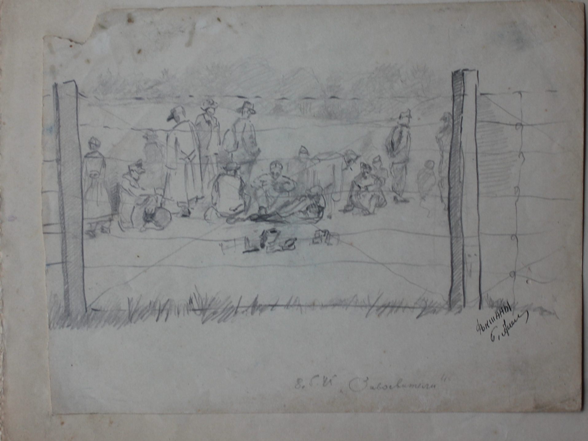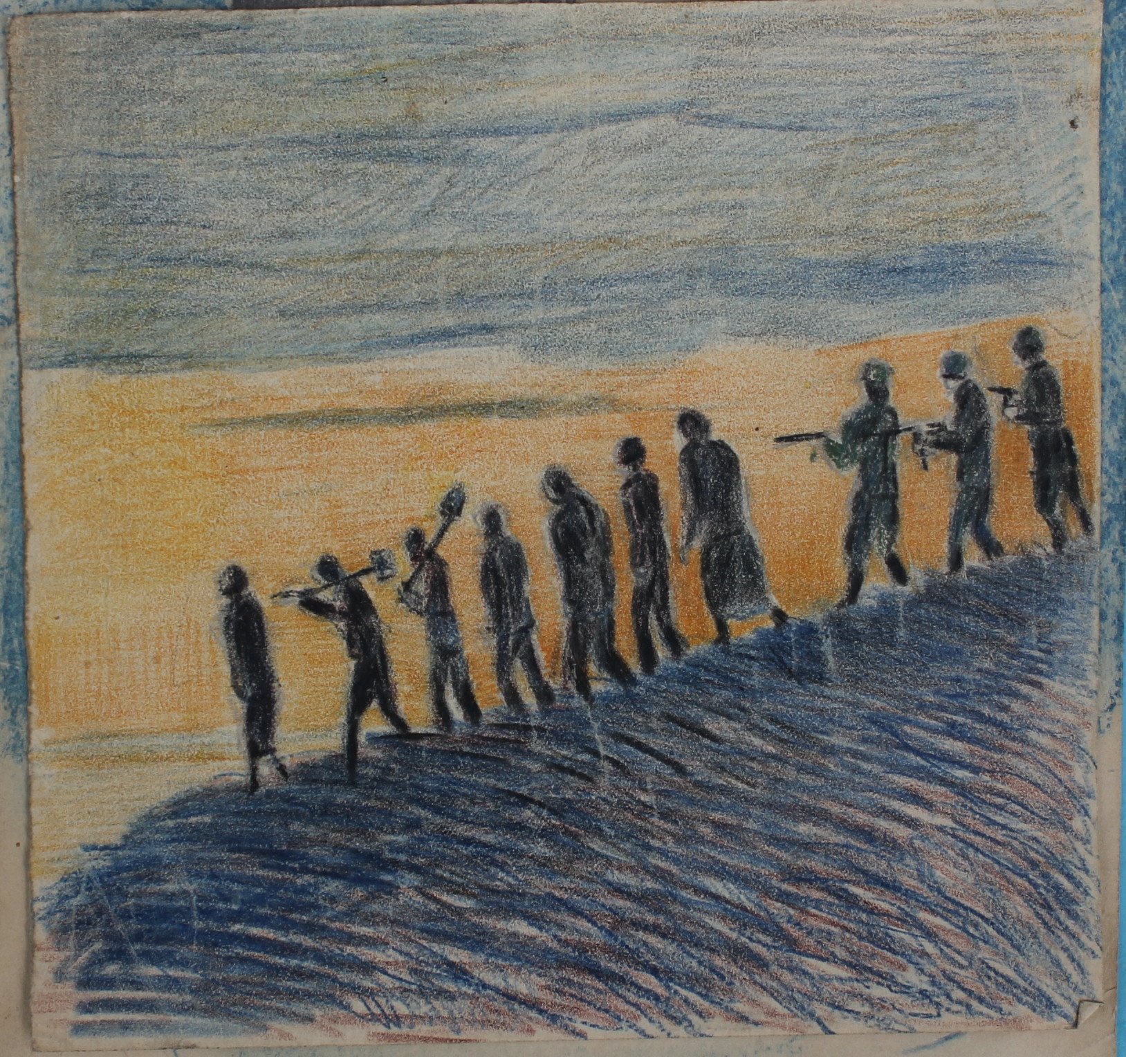 Рисунок тушью и пером "Военнопленные поют песню о родине"