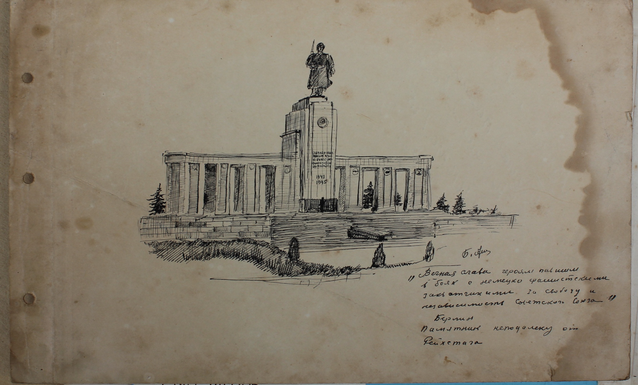 Рисунок тушью и пером "Вечная слава героям погибшим в боях с немецкого фашисткими захватчиками за свободу и независимость Советского Союза " Берлин, неподалеку от Рейхстага, 2