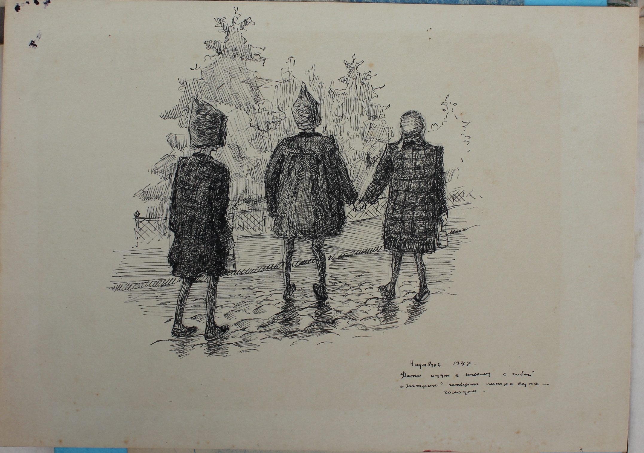 Рисунок тушью и пером "Наумбург 1947г.Дети идут в школу с собой "завтрак" четверть литра супа- голодно "5