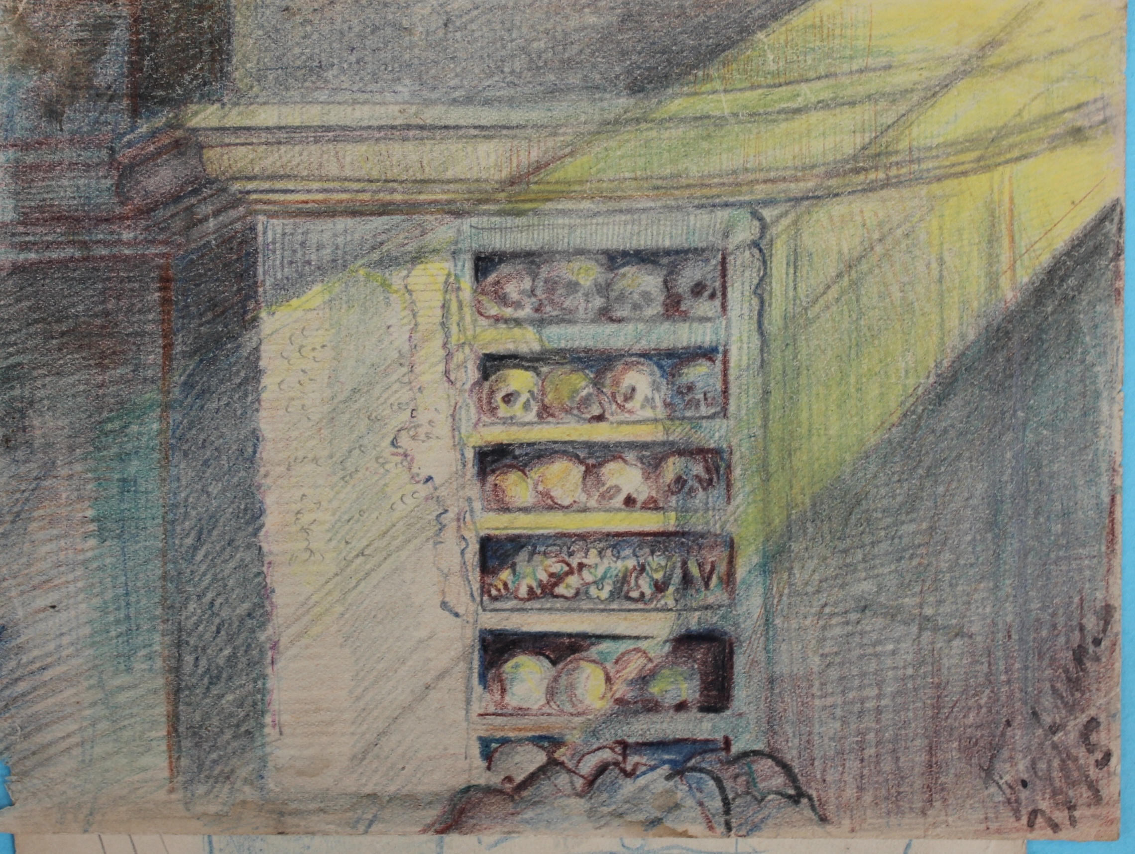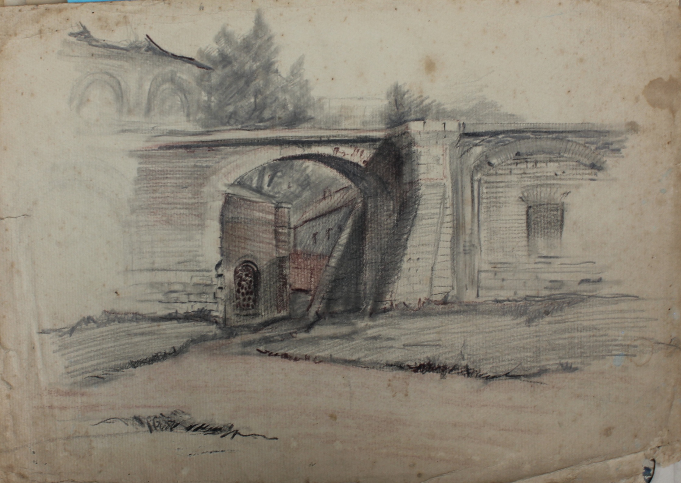 Рисунок карандашом "Внутри мавзолея * от взрыва фугаски отпала плита стены катакомбы "