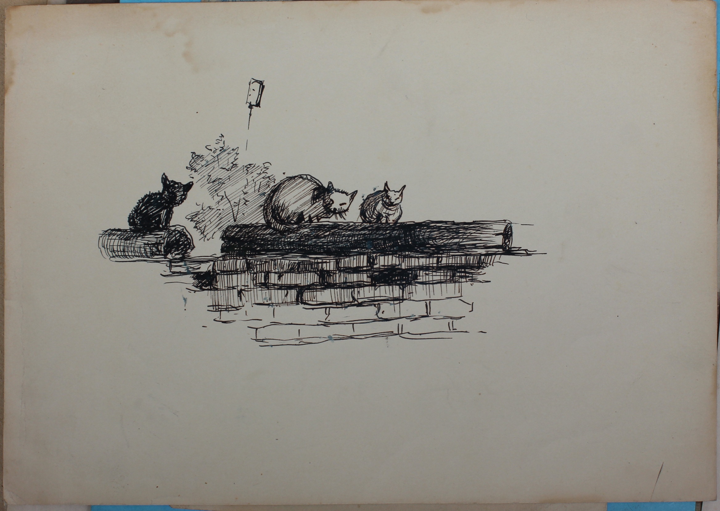 Пейзаж тушью и пером "От дома остались развалины и кошки (Создано) "