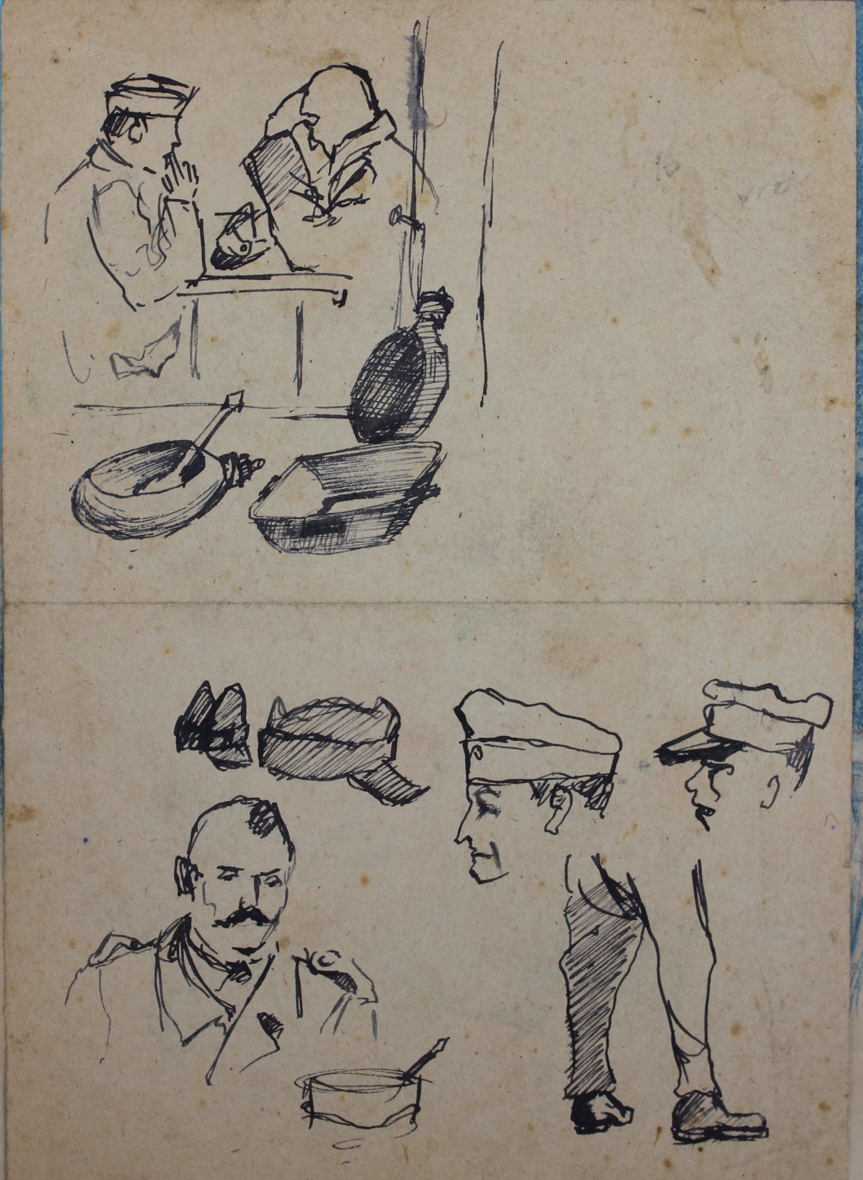 Рисунок тушью и пером "Солдат торгует сигаретами, городовой, осмоторщик вагонов на пероне"17