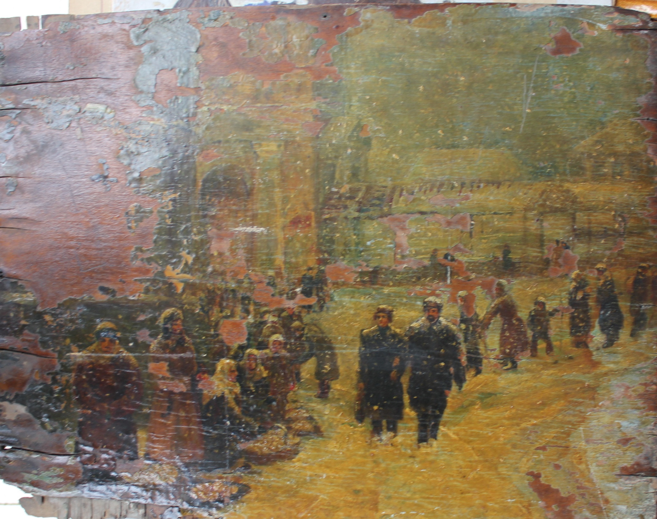 Рисунок "Наумбург 1945г." "На рынках мало продуктов, часто похитители ожидают привода. У многих обувь плетённая из соломы, на деревянной подошве и вся деревянная "