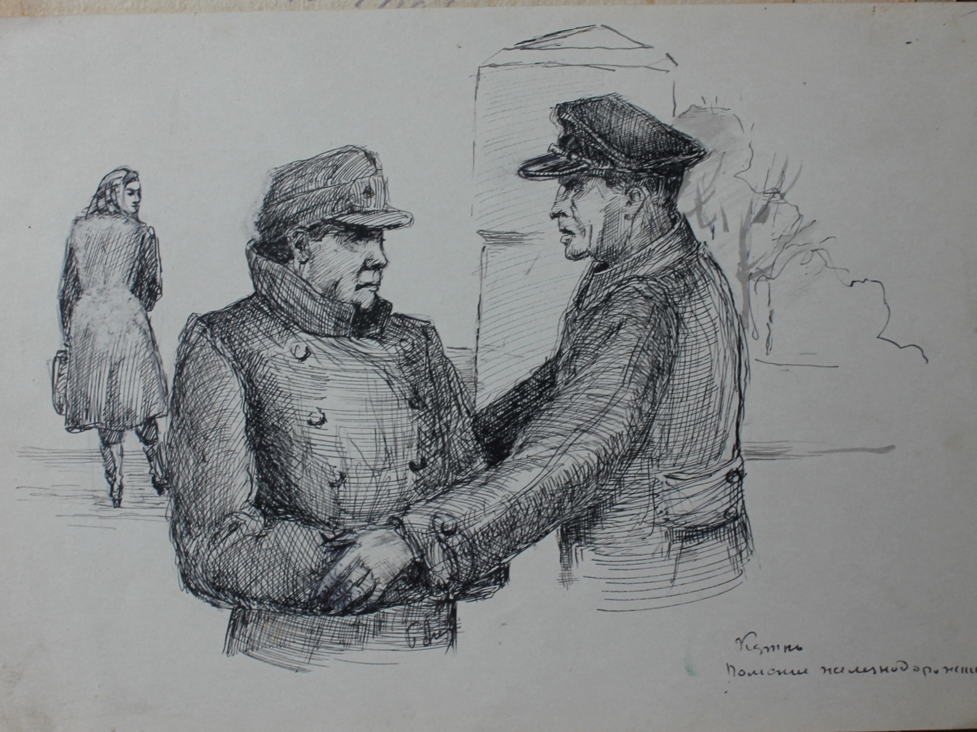 Рисунок тушью и пером "Брест. Кондукторы немцы и "пилот" поляк который по его словам отвечает за семафоры. Сзади немецкий паровоз"15