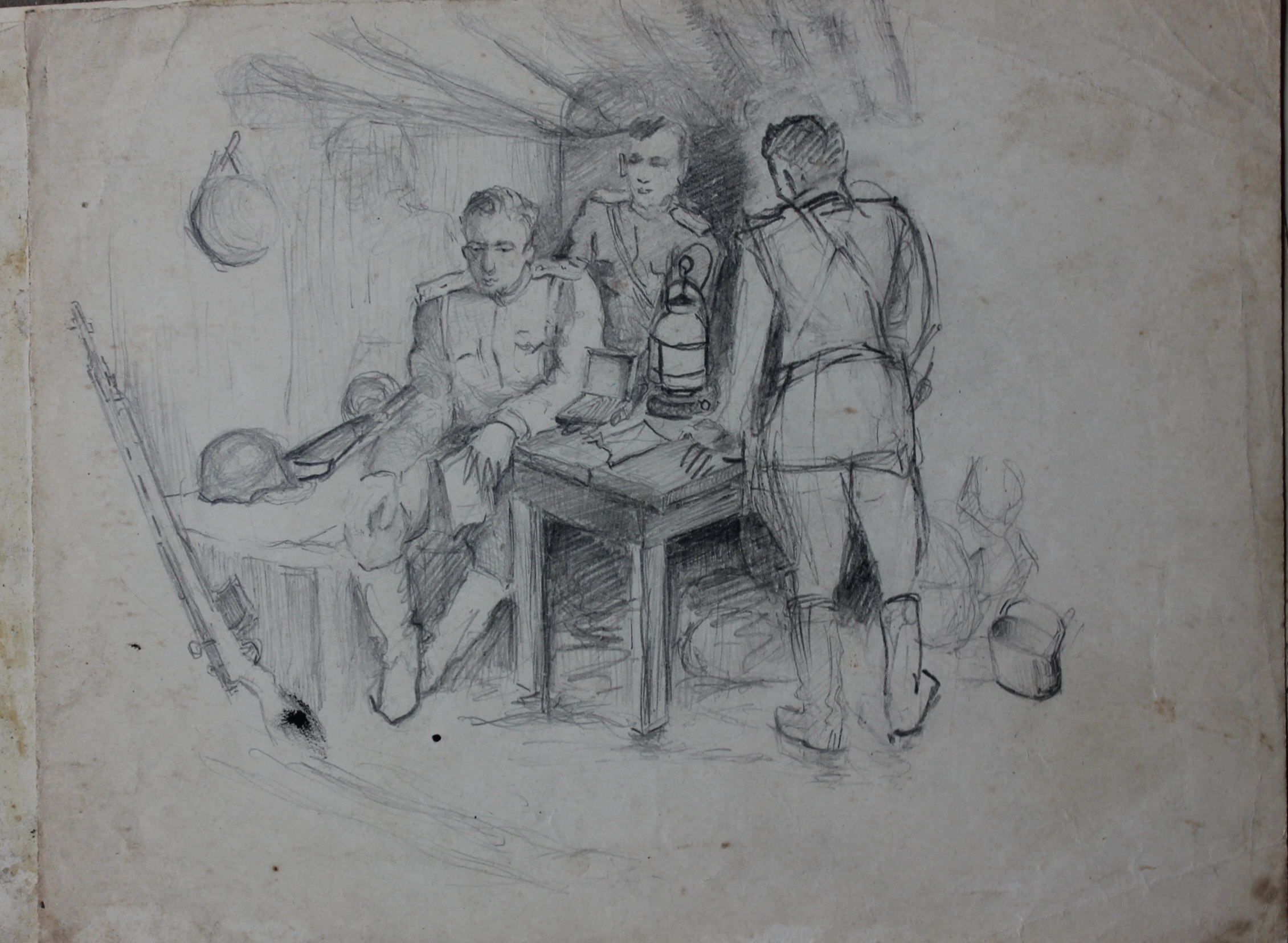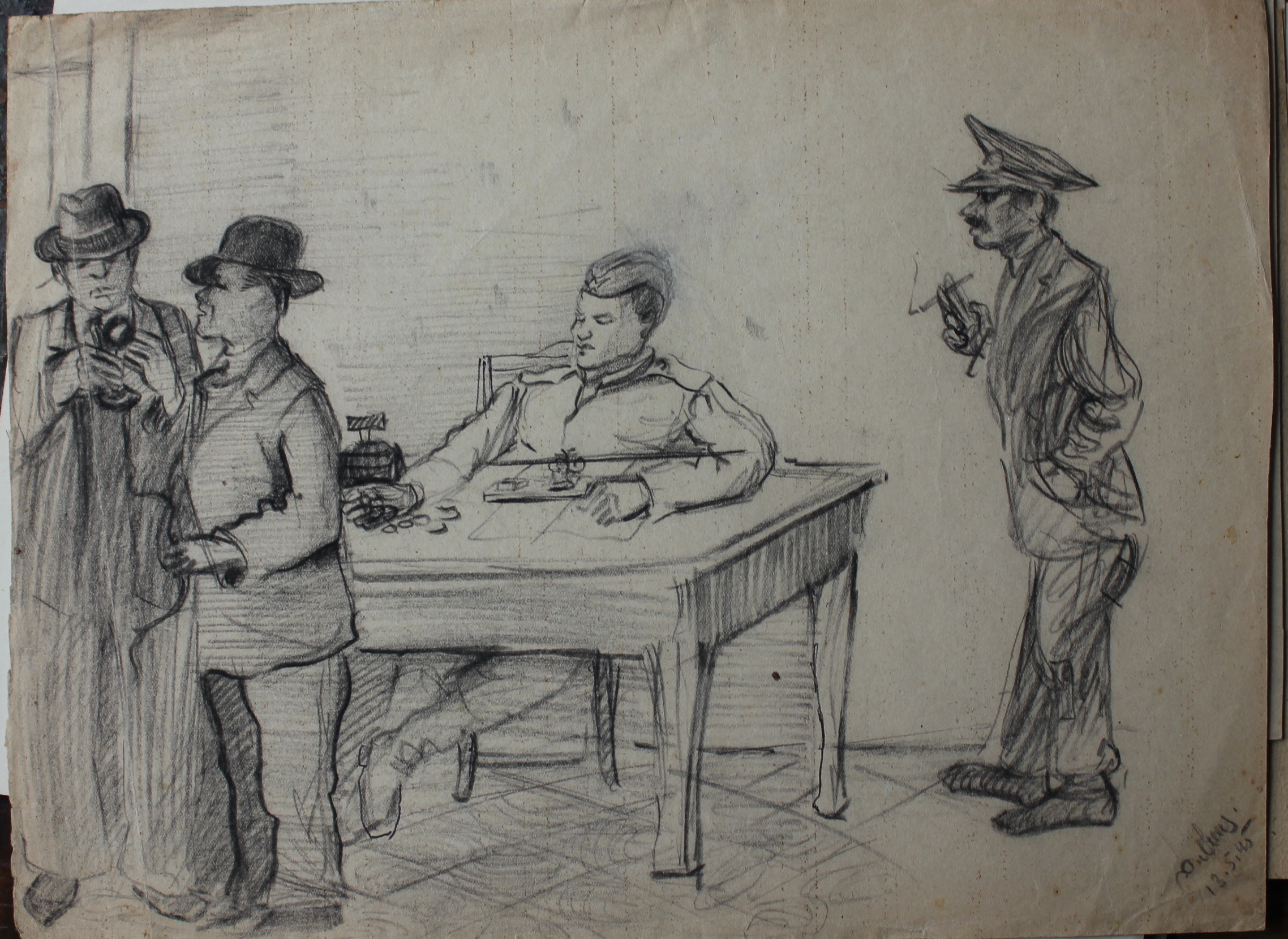 Рисунок карандашом "Фокшаны, В комендатуре телефон не работает, 13.05.1945 г. "