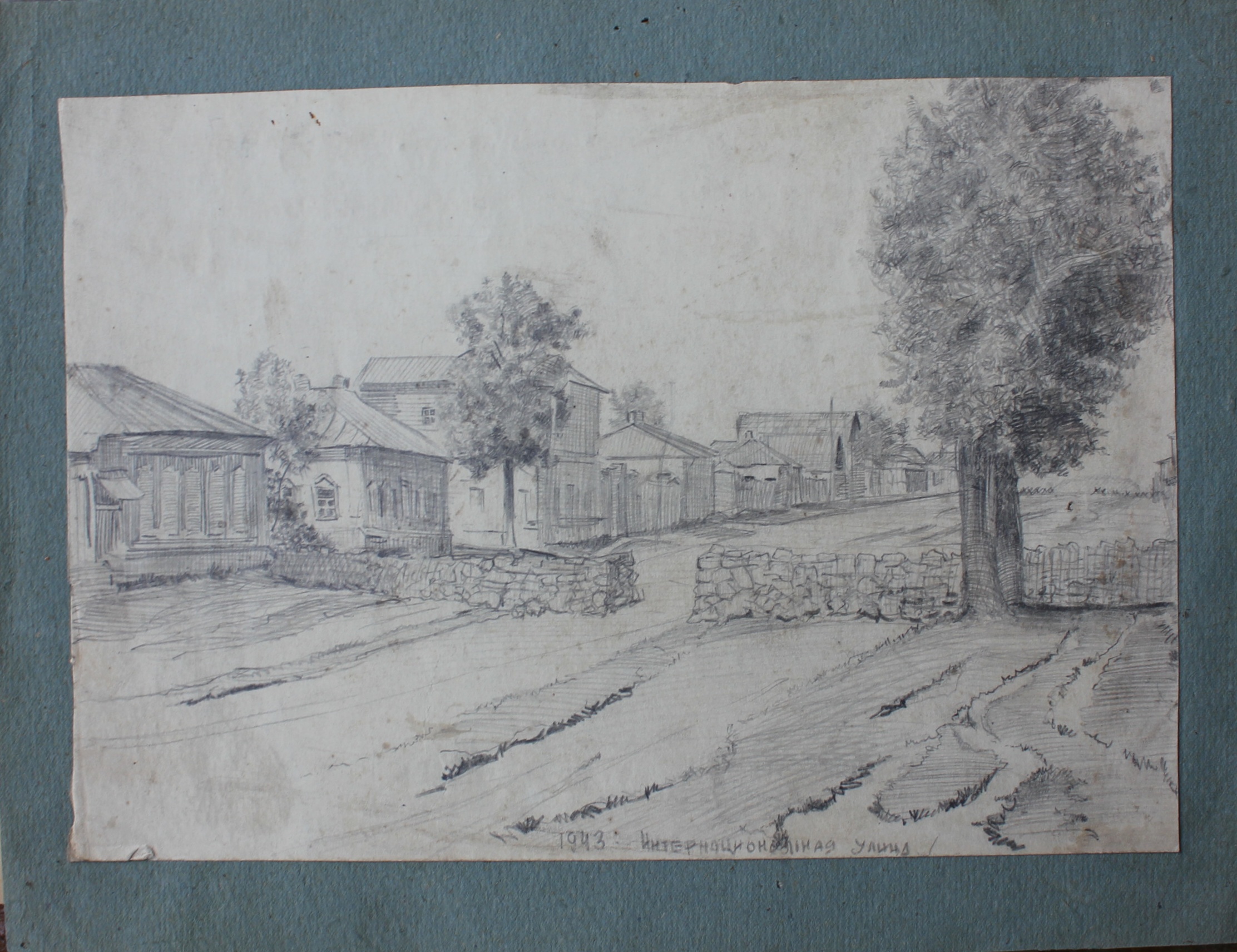Рисунок карандашом "Интернациональная ул. г. Лебедянь 1943 г. " (заграждение от танков) 58