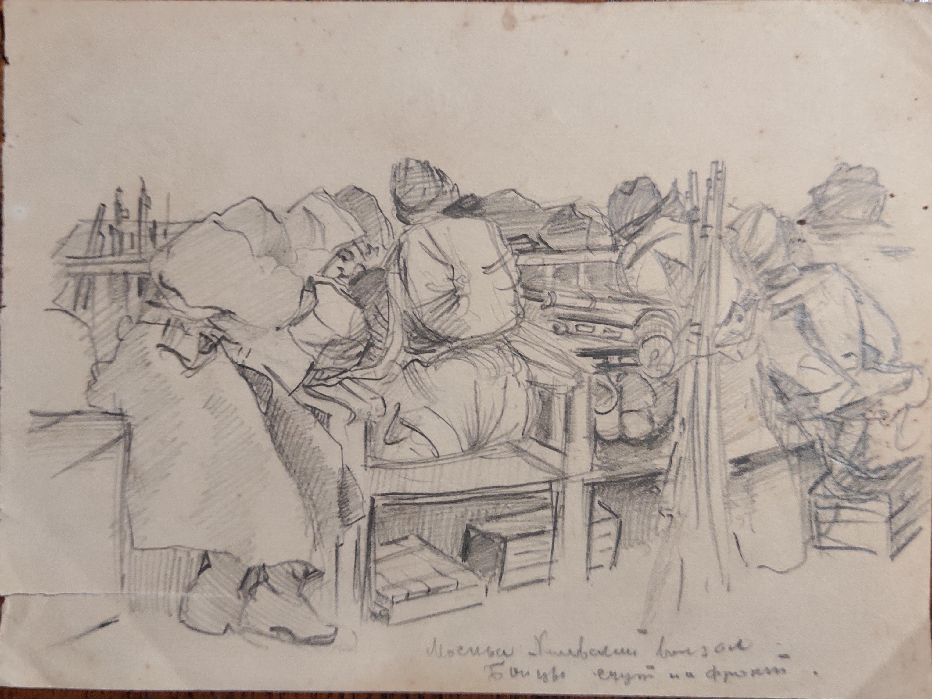 Рисунок карандашом "Москва Киевский вокзал, Бойцы едут на фронт" 44
