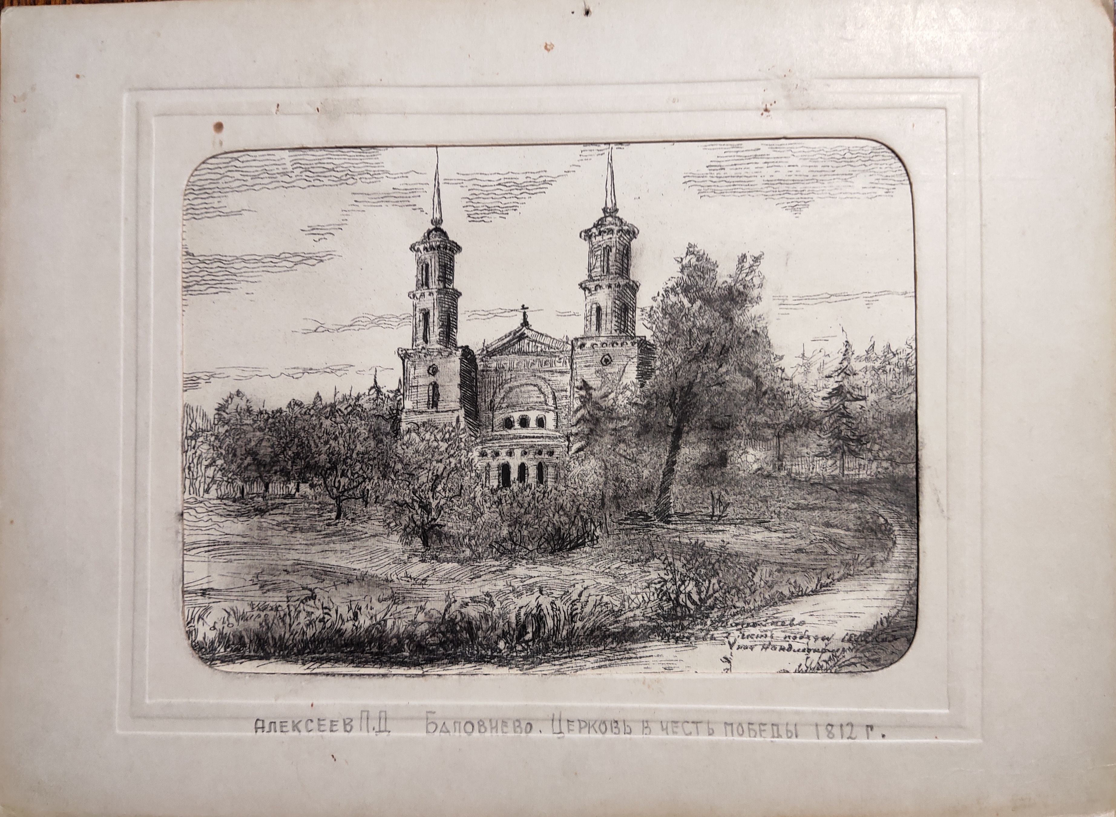 Рисунок тушью и пером "Баловнево. Церковь в честь победы 1812 г. "