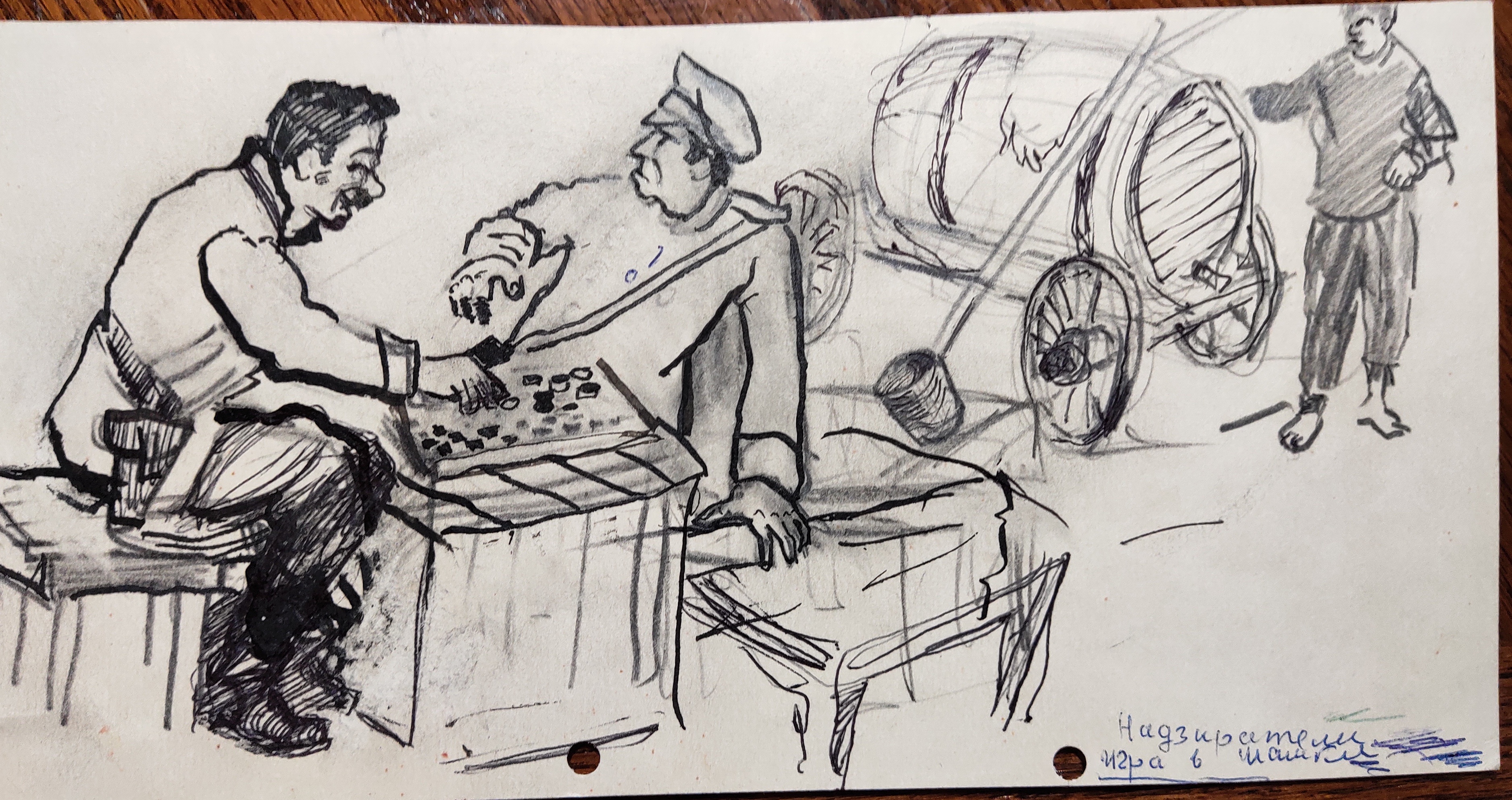 Рисунок пером и тушью "Кино. Польские железнодорожники"