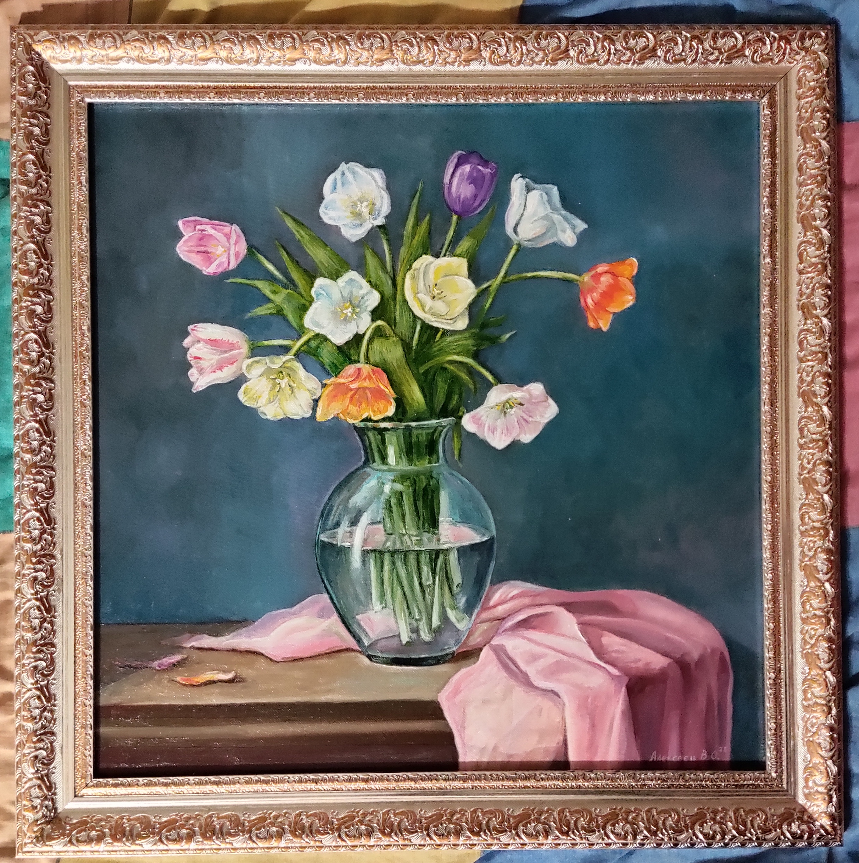 Реплика на картину художника Корнелис ван Спандонк "Натюрморт с попугаем, тюльпанов, розами и другими цветами в корзине на мраморном выступе "