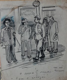 Рисунок тушью и пером и карандаш "Май1945г., Фокшаны ( С миром! Миром! - Нет с победой!) "