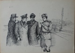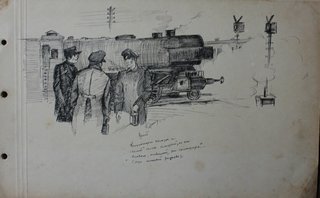 Рисунок тушью и пером "Брест. Кондукторы немцы и "пилот" поляк который по его словам отвечает за семафоры. Сзади немецкий паровоз"15