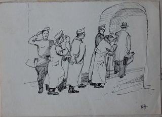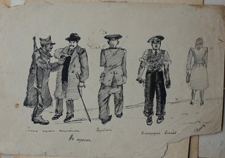 Рисунок тушью и пером "Солдат торгует сигаретами, городовой, осмоторщик вагонов на пероне"17