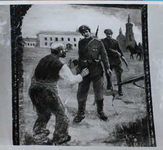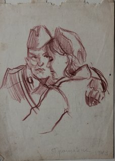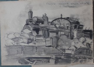 Рисунок карандашом "Интернациональная ул. г. Лебедянь 1943 г. " (заграждение от танков) 58